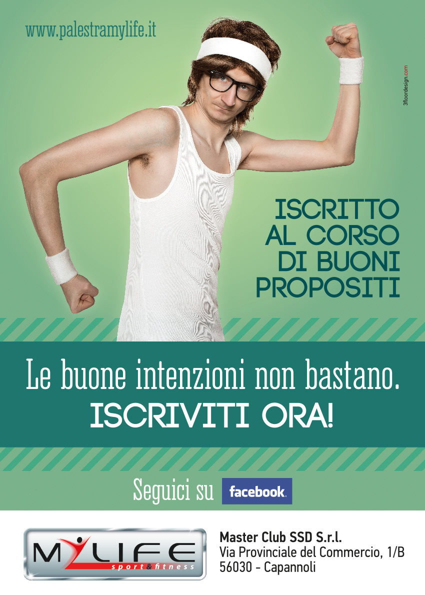 La campagna multisoggetto è un invito rivolto a tutte le persone e potenziali iscritti a mettere da parte i buoni propositi e, con l’anno nuovo, ad iscriversi in Palestra evidenziando, appunto, le “buone intenzioni” ed i risultati che si ottengono lasciandosi sopraffare dal continuo rimandare l’iscrizione in palestra. Ecco cosa accade a chi è iscritto al corso di buoni propositi!